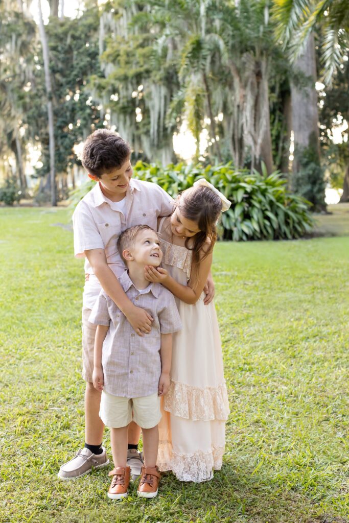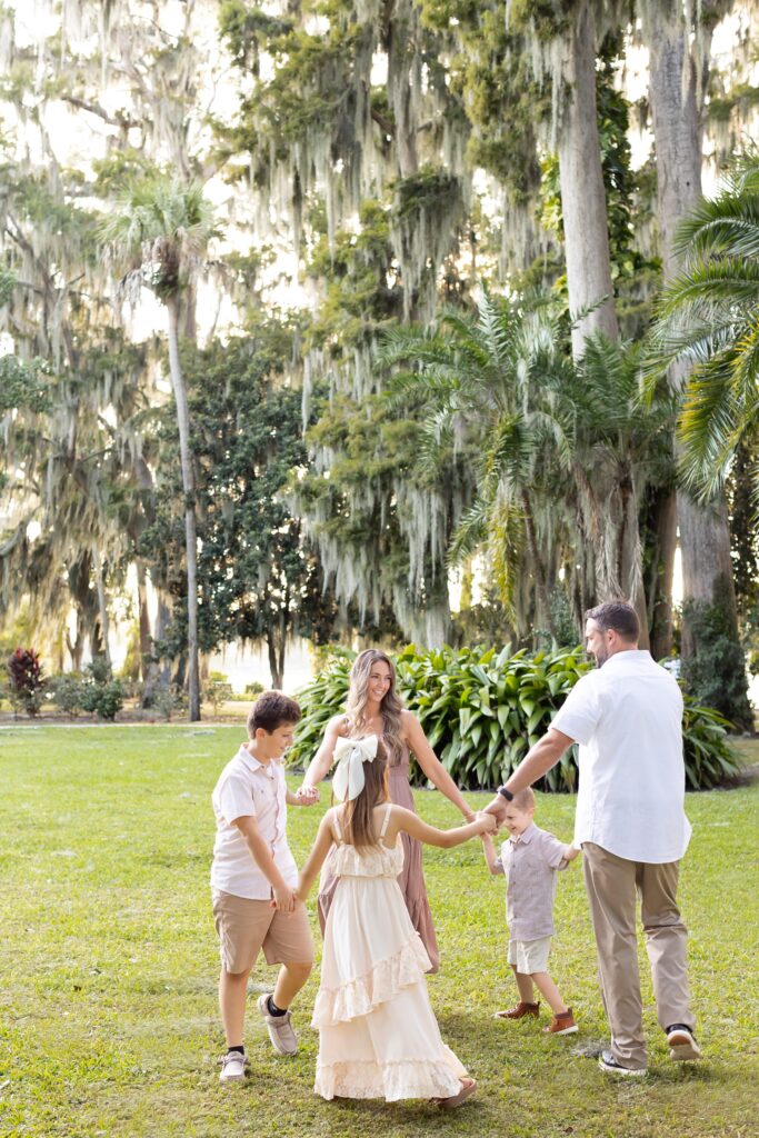 Kraft Azalea Gardens offers one of the most beautiful settings for a family photo session in Central Florida. It’s filled with towering cypress trees, soft light filtering through the leaves, and peaceful waterfront views that create a timeless backdrop. During our session, the light was absolutely perfect — that dreamy golden hour glow that makes every moment look like a painting.